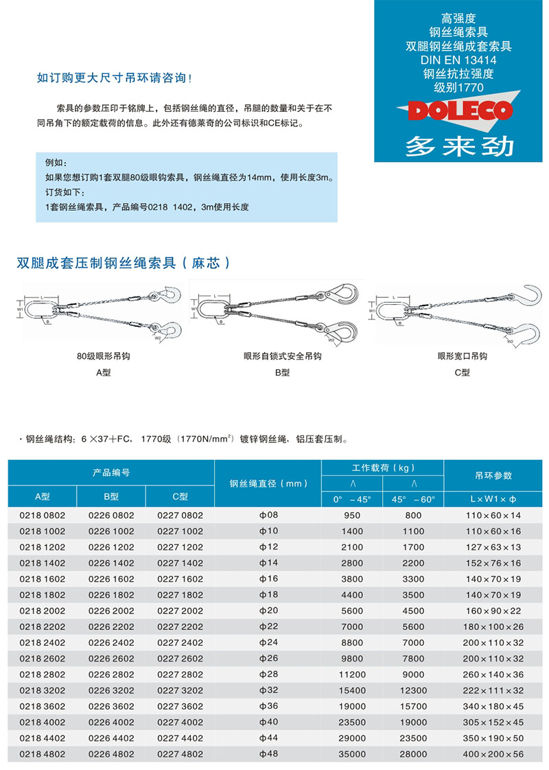 DOLECO雙腿成套壓制鋼絲繩索具(麻芯)